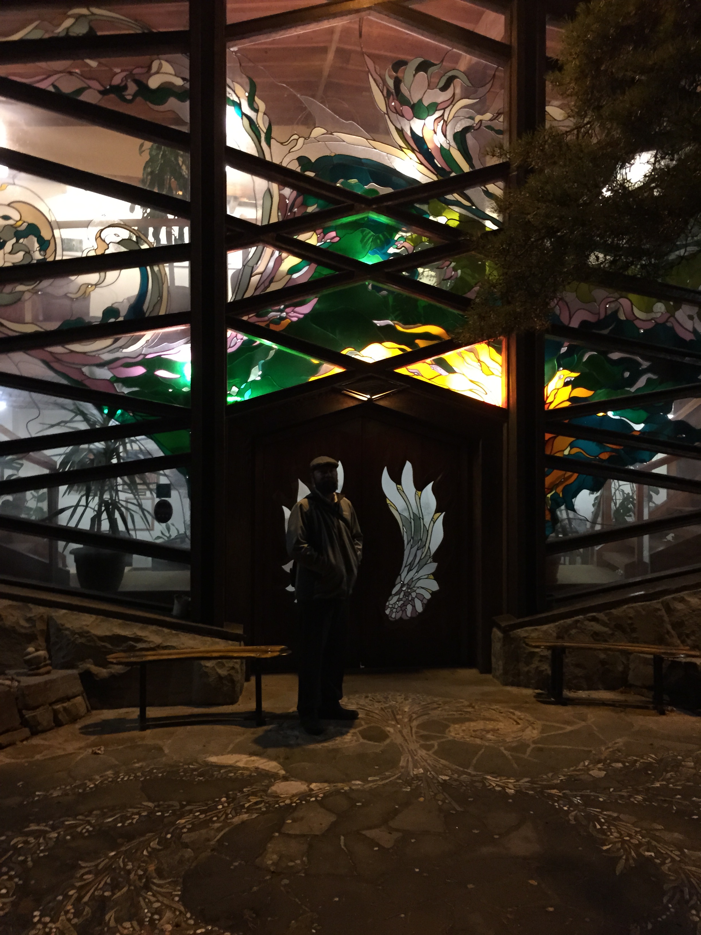 Last evenings’ gig was at Universal Hall in the community of Findhorn. The community was planned as a bit of an alternative living environment, if I understand correctly. It’s a cozy place right on the North Sea. I suppose you have to make it a cozy place if you’re planning a community on the North Sea. The hall itself is beautiful, with an enormous glass entryway inset with a double door which itself wears a pair of leaded glass wings. It was impressive during the day, but positively stunning at night. The crowd was a bit more polite at the show, but came to the CD table in droves, so I suppose we made a good impression on them. We’re a double in Dundee and Edinburgh today, so it’s time to get rolling.
